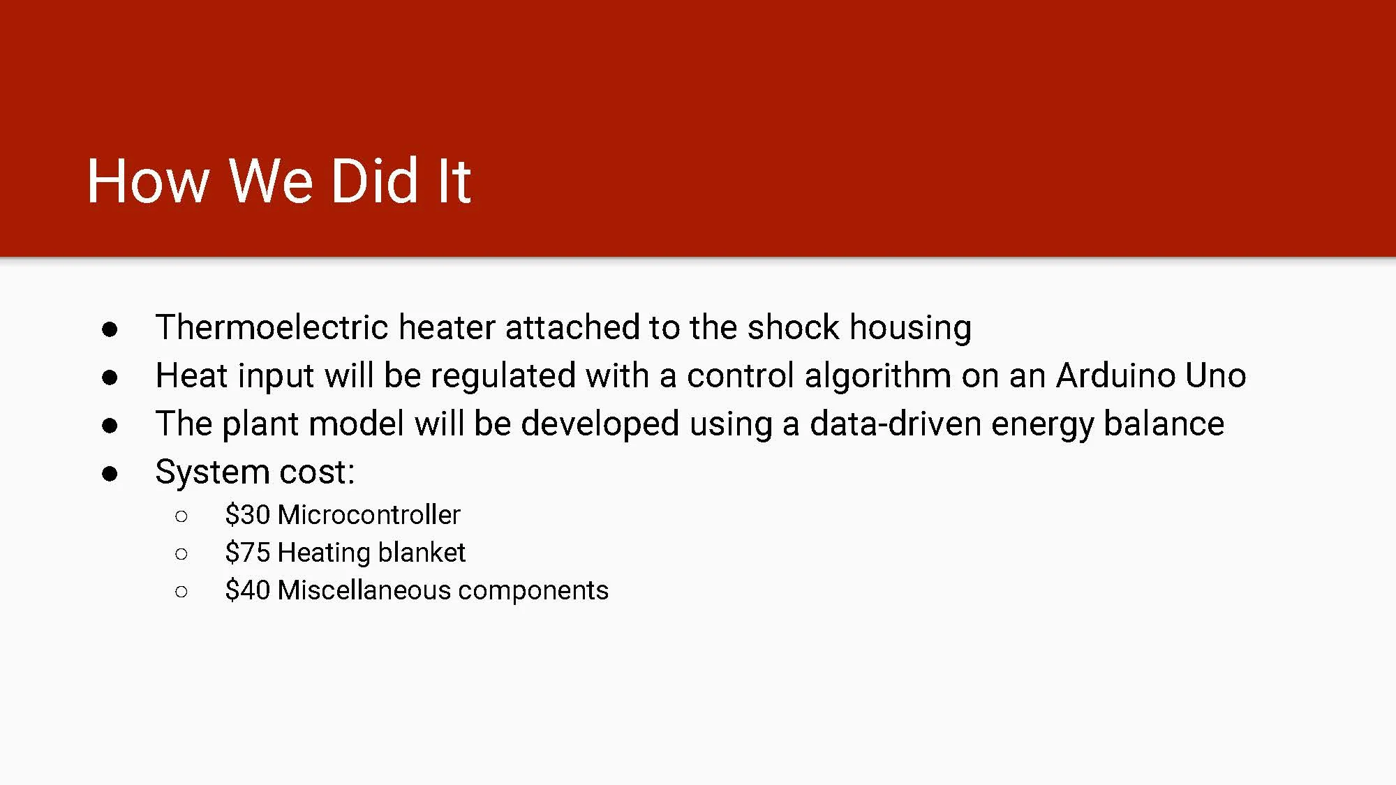 However, after using the estimated heat transfer coefficient in simulations, it did not seem to agree with our data, especially in the transient cases. This discrepancy is most likely due to the fact that the velocity used in forced convection calculations is not easily defined in this scenario and because there is no empirical relation that exactly fits the motion of the shock dyno. Because of this, on the suggestion of our GSI, Spencer, we decided to estimate the power input to the shock (via the motor) rather than the convective heat loss. We have received the specifications for the motor being used by the dyno, and now we must make appropriate assumptions and use our data to calculate the power input, and thus estimate the heat generation due to viscous forces within the shock. This work is scheduled to be completed within the next couple days, and I’m excited to see our simulations coming together so we can start working on the hardware in the near future.